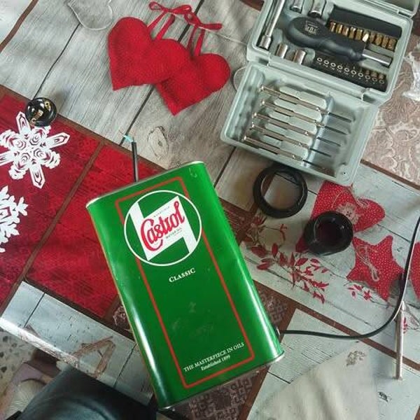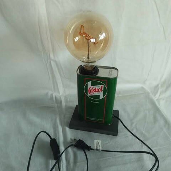 Un vieux bidon, une chute de panneau, une ampoule de style et un système électrique aux normes pour cette petite lampe au look atelier mécanique.