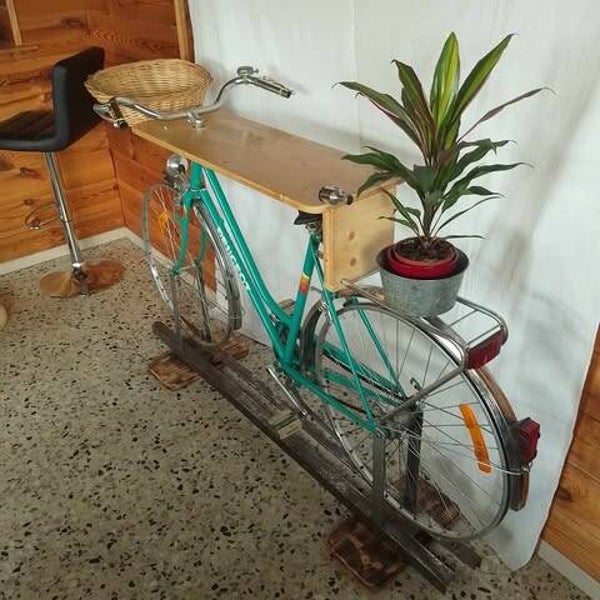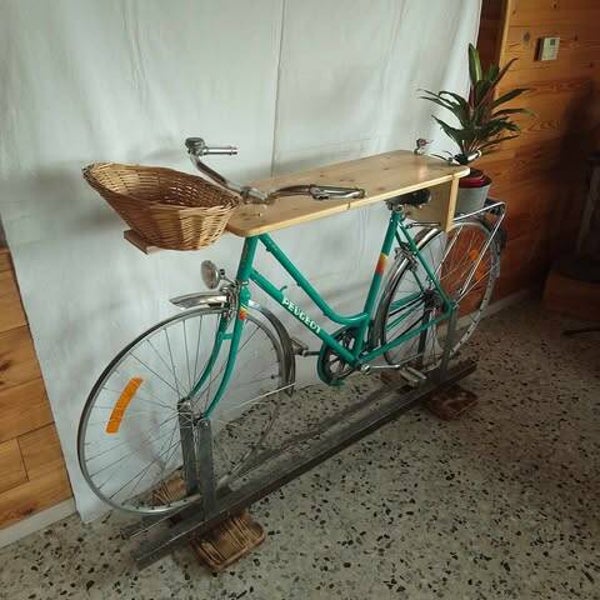 Vélo récupéré le long d'une route, entièrement démonté et nettoyé. Equipé d'un piétement solide en acier et en bois, d'une tablette en pin, d'un petit pot sur le porte bagage et d'un panier en ozier à l'avant.