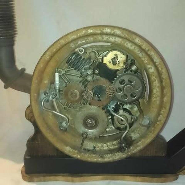 Tout en récup, cet escargot dont la coquille est réalisée avec une jante de voiture est destinée à la décoration intérieur.