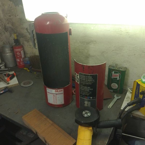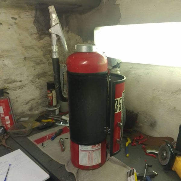 Un extincteur des années 90, des chutes de bois : et voilà ce petit bar fait main, laissé dans son jus et sa patine gagné au fil du temps.