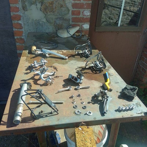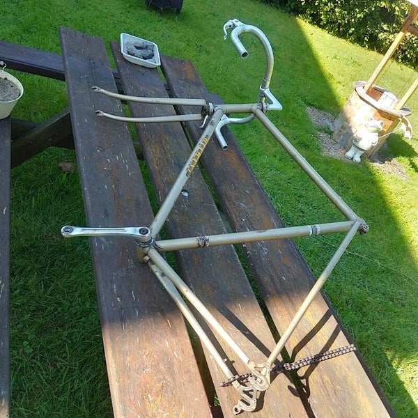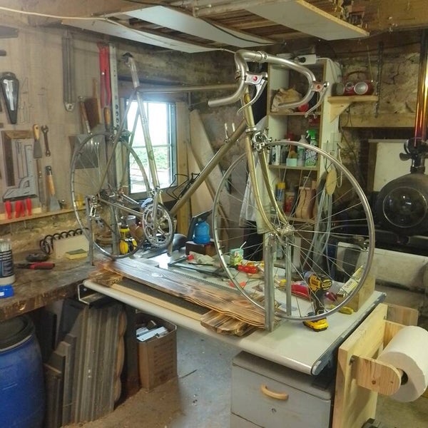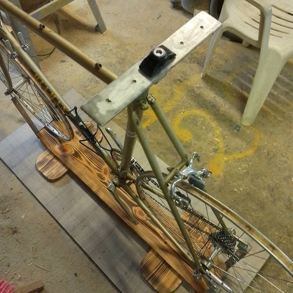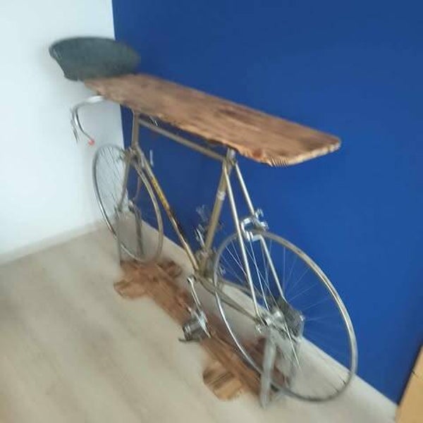 Garni d'une tablette brûlée et d'un panier en osier sur le devant.