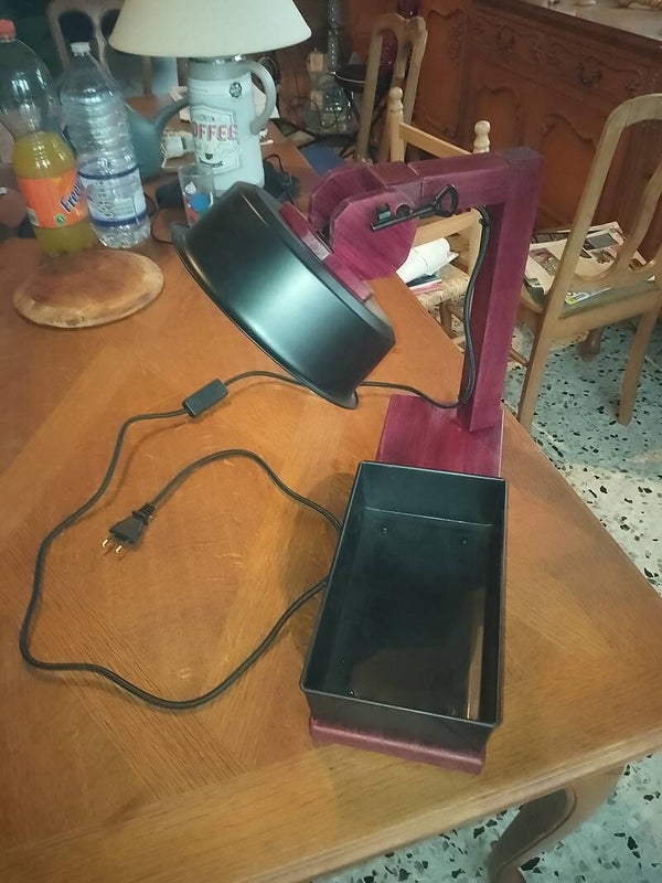 D'anciens moules à gâteau, du bois de Padouk retrouvé sur chantier, système de serrage de l'orientation de la lampe par une clé ancienne et nouveau système électrique.