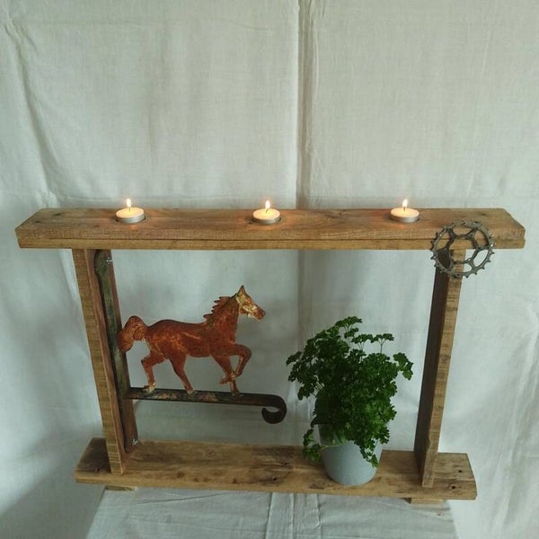 Cadre en bois de palette et cheval de fer, ambiance bougies et plantes.